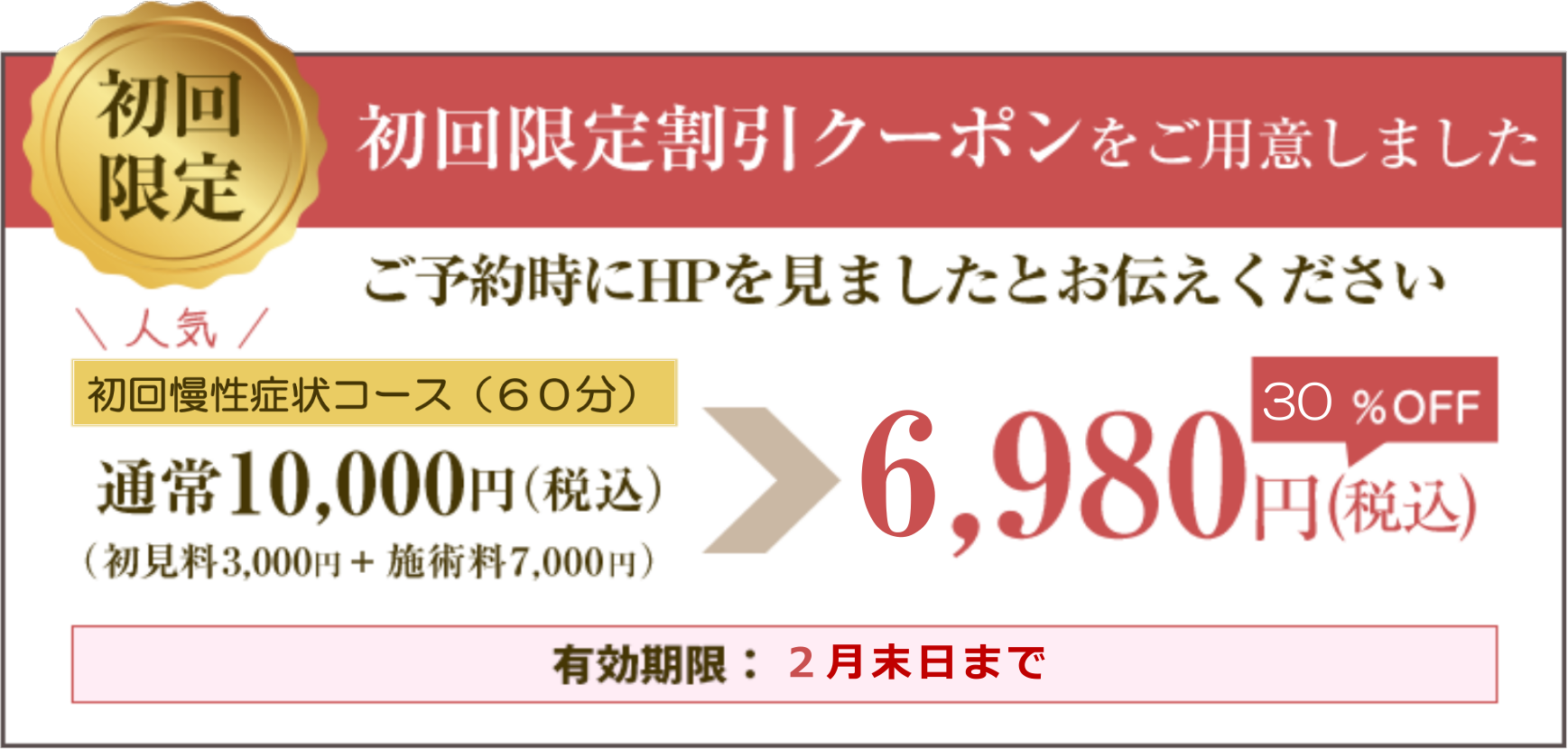 病院や整体に何件通われても治らなかった何十年来の肩こり腰痛。そんな症状をお持ちのかたにおすすめのコースです。